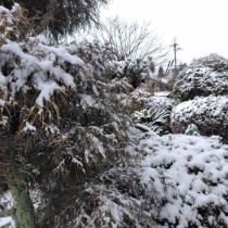 昨日の夜明けに、大雪警報のお知らせメールが届きました。 朝起きたら一面雪景色かと思って裏庭に出たら、まったく積もっていませんでした。 午前8時ごろから、湿った雪が降ってきました。 午前10時ごろの裏庭です。 小梅の枝にも雪が積もっていました。 母屋の前 ...
