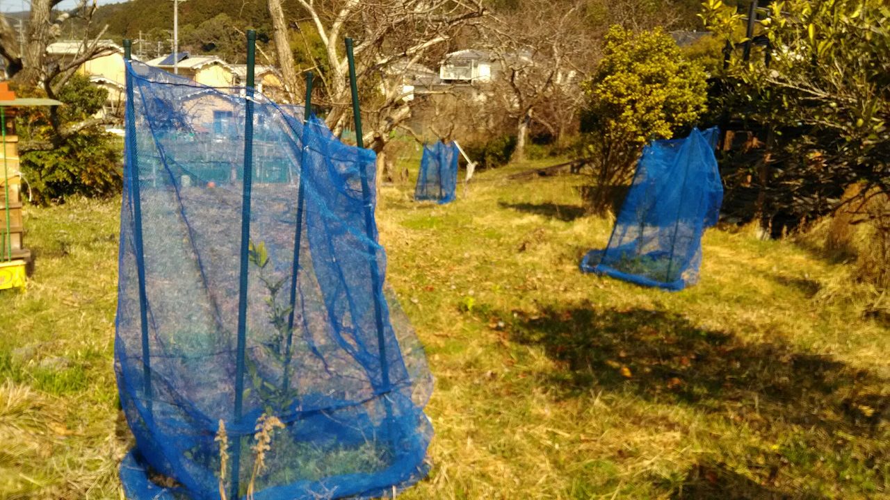 この写真のように果樹の苗を植えて、ネットで囲いをしています。