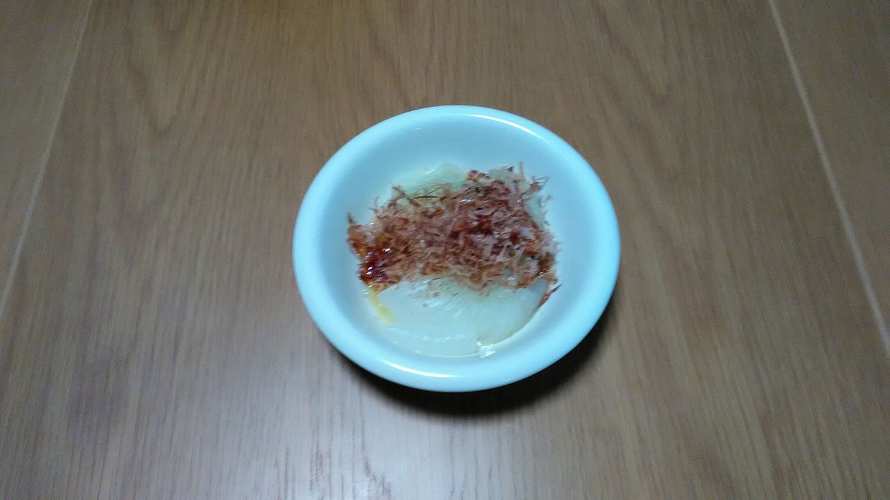④ 味醤油(だし醤油)少しと鰹節をかけて出来上がりです。