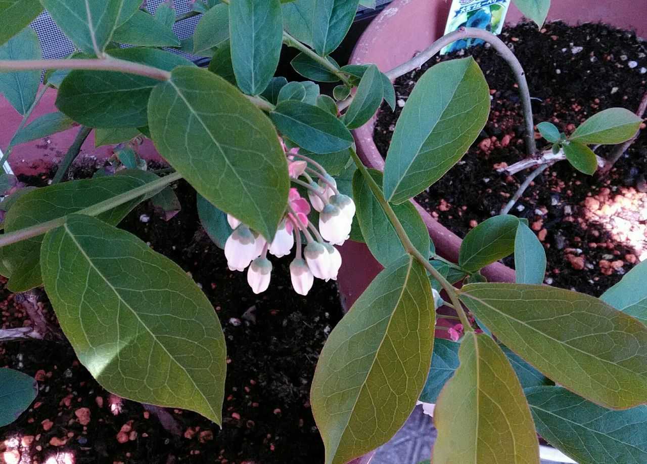 この白いかわいい花は、ブルーベリーです。鉢植えの方です。露地植えの方は、新芽が出てきたところです。