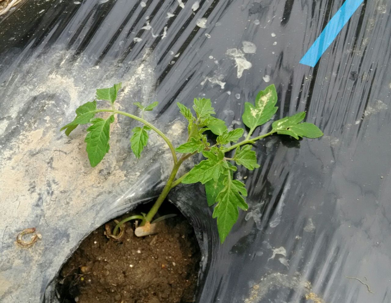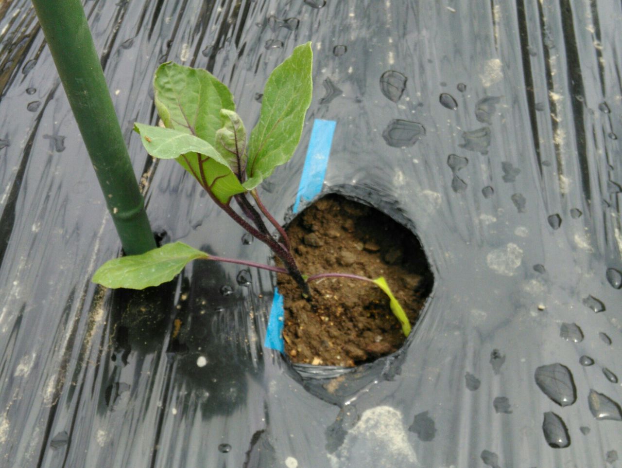 先日張ったマルチに穴を開けて、茄子の苗を植えました。