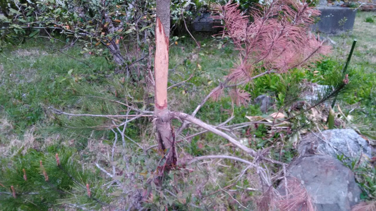これは、家の庭?(どこまでが庭で、どこから畑か分からない)の松の木です。樹皮が食べられています。枝も一部枯れています。