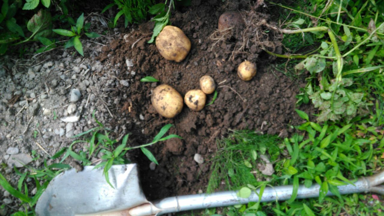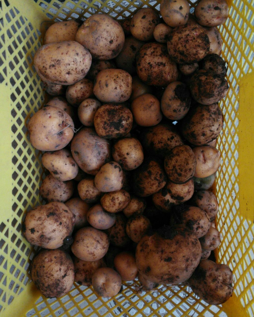 今日は、朝から庭の草引き、里芋の追肥、土寄せをした後、ジャガイモ「キタアカリ」の収穫をしました。