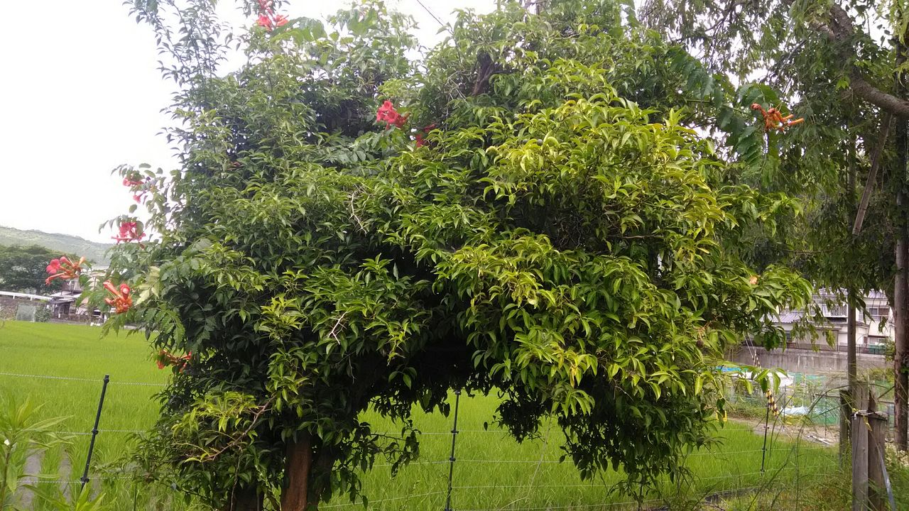 西側から見ると「ノウゼンカズラ」、東側から見ると「ユズ」です。
