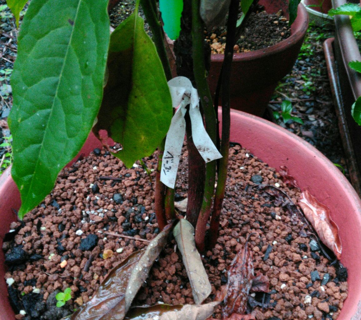 左の昨年のベーコンは、穂木(ベーコン)が枯れて地中から出てきた新芽は台木からです。台木にどのような種類が使われているのか分かりません。