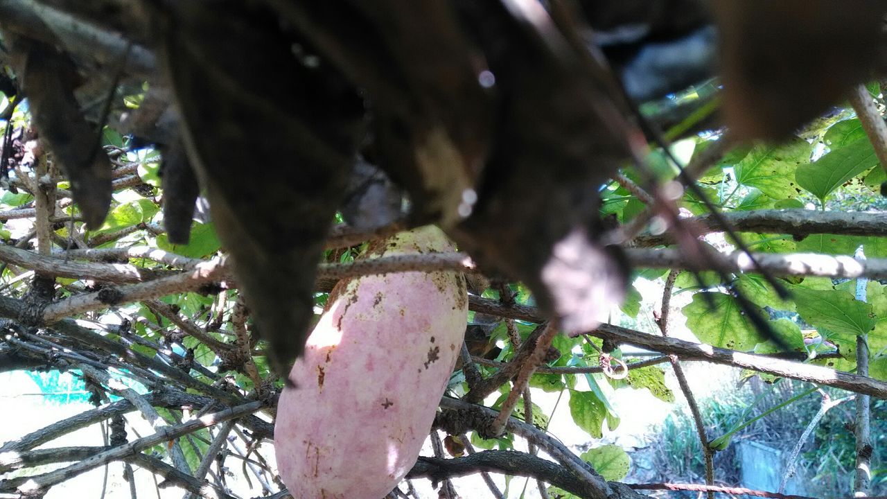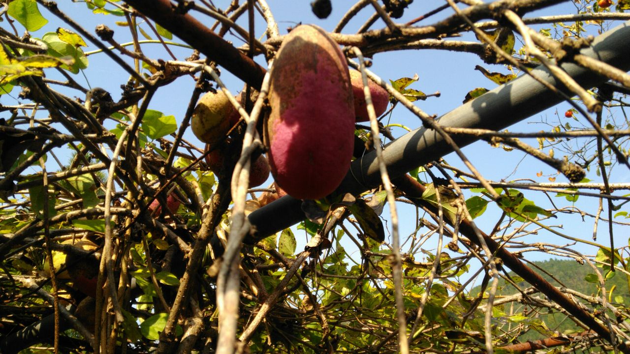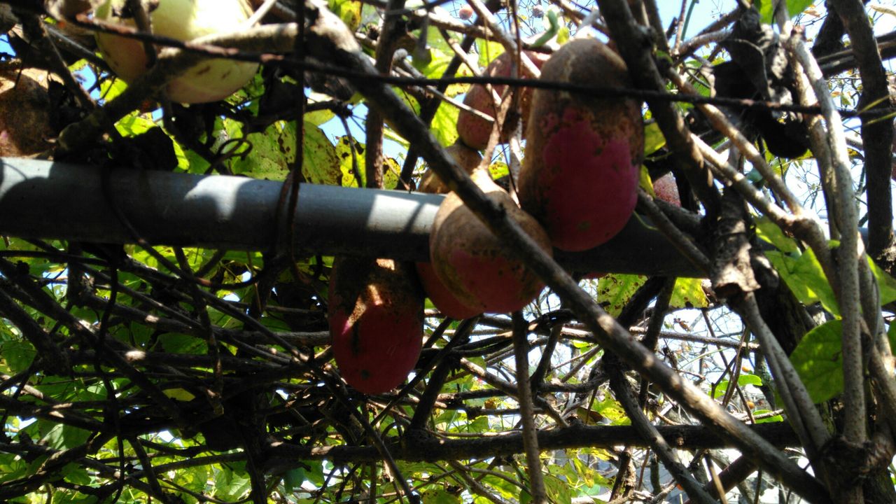 作業をしている時に、キウイと同じ棚にあるアケビの実を見つけました。写真のゴールドキウイ雄の左右奥に見えるねじれた蔓です。