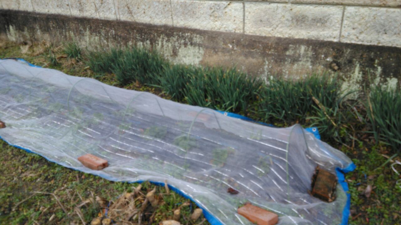 ネットと塀の間に生えているのは、先日UPした水仙(スイセン)の一部です。