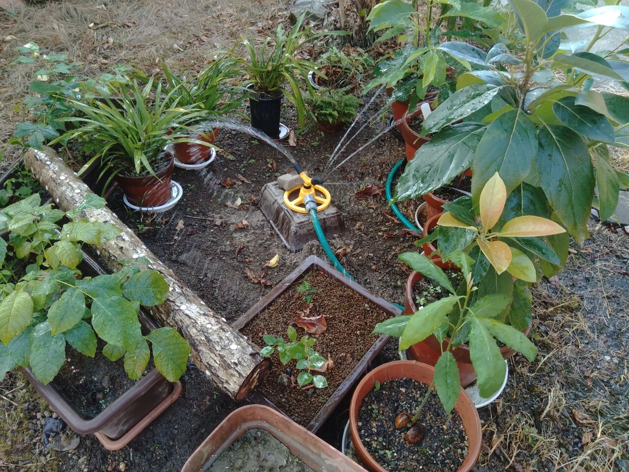 スプリンクラーの周りに集めているのは、アボカド、ポポー、キンリョウヘン、クルミ、ねじ花、ブルーベリーの挿し木などです。