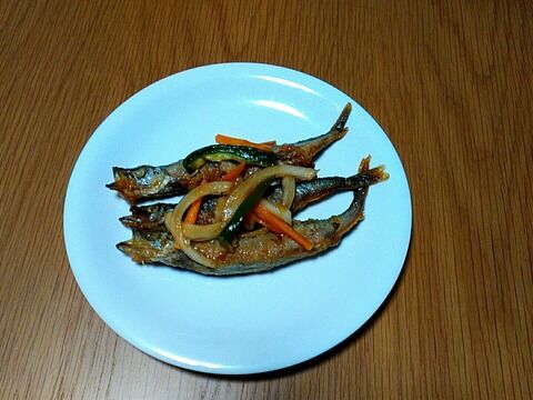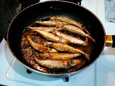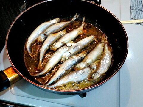 そこに、フライパンで焼いたシシャモを入れて漬けておきます。