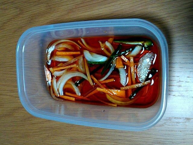 タッパーに、酢、醤油、砂糖、玉ねぎ、人参、ピーマンを入れます。