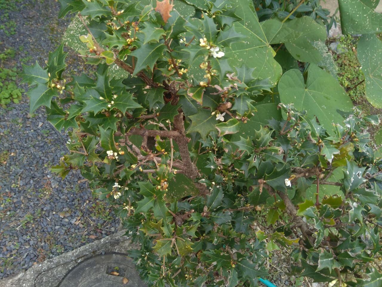 裏庭の柊(ヒイラギ)ですが、今年は昨年よりたくさん花が咲いています。
