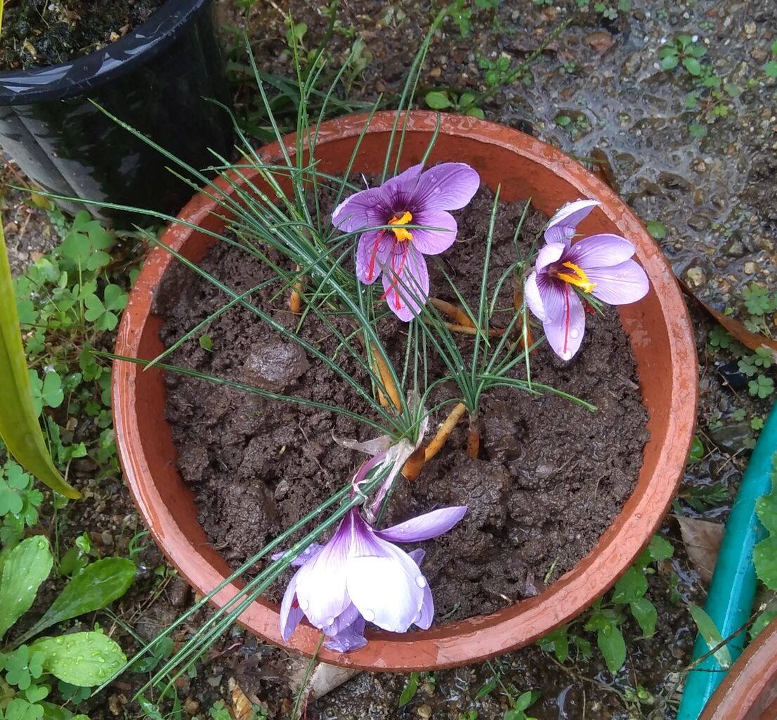 サフランかどうか分からない花ですが、畑の雑草の中で咲いているのももったいないので、3株だけ掘ってきて、鉢植えにしました。