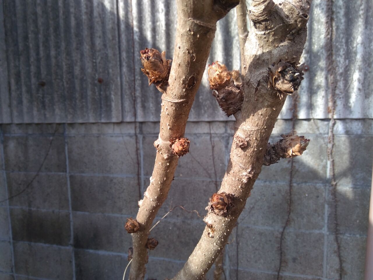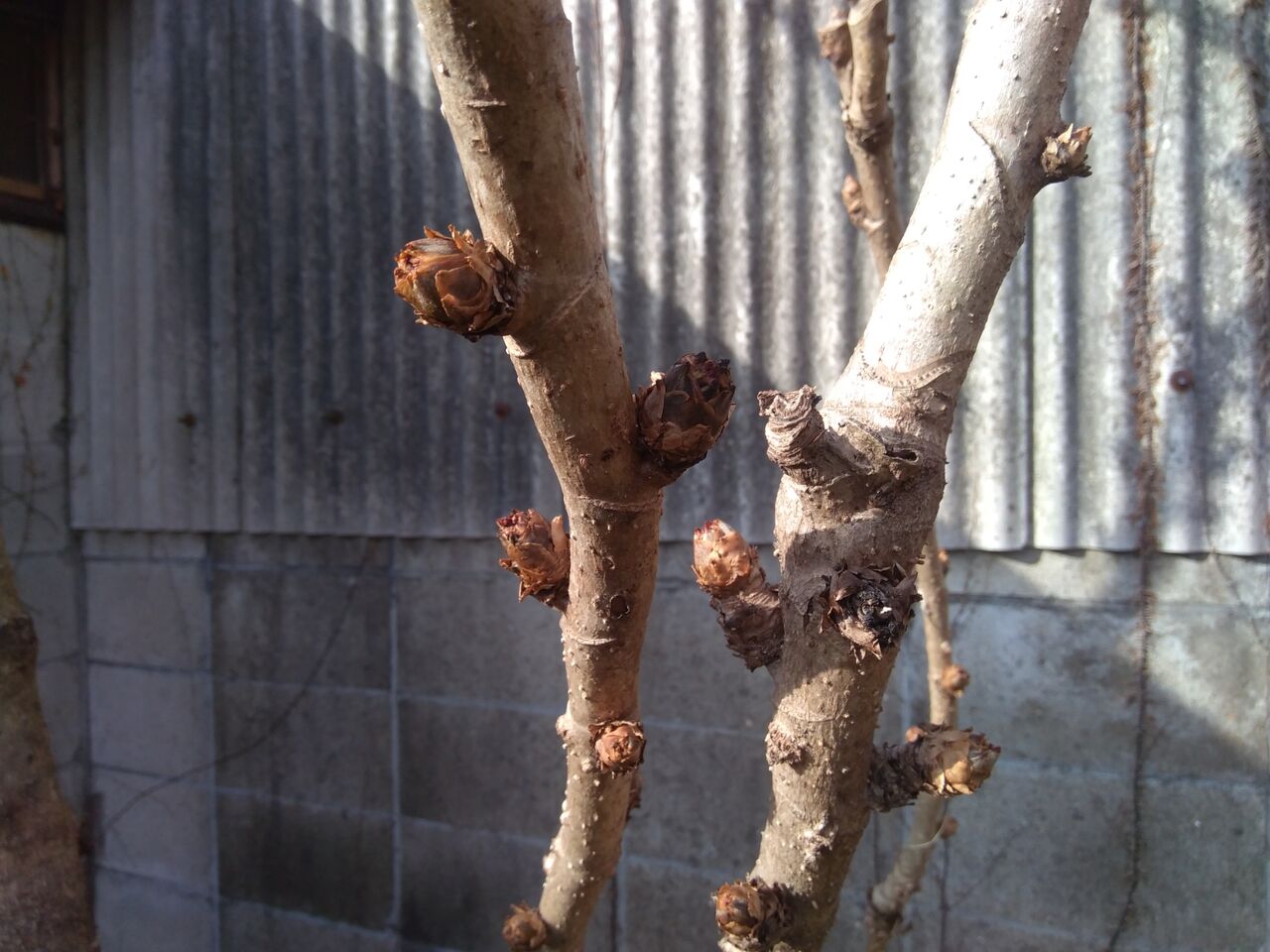小屋の裏のタラの木の芽も膨らみ、春を待っているようです。