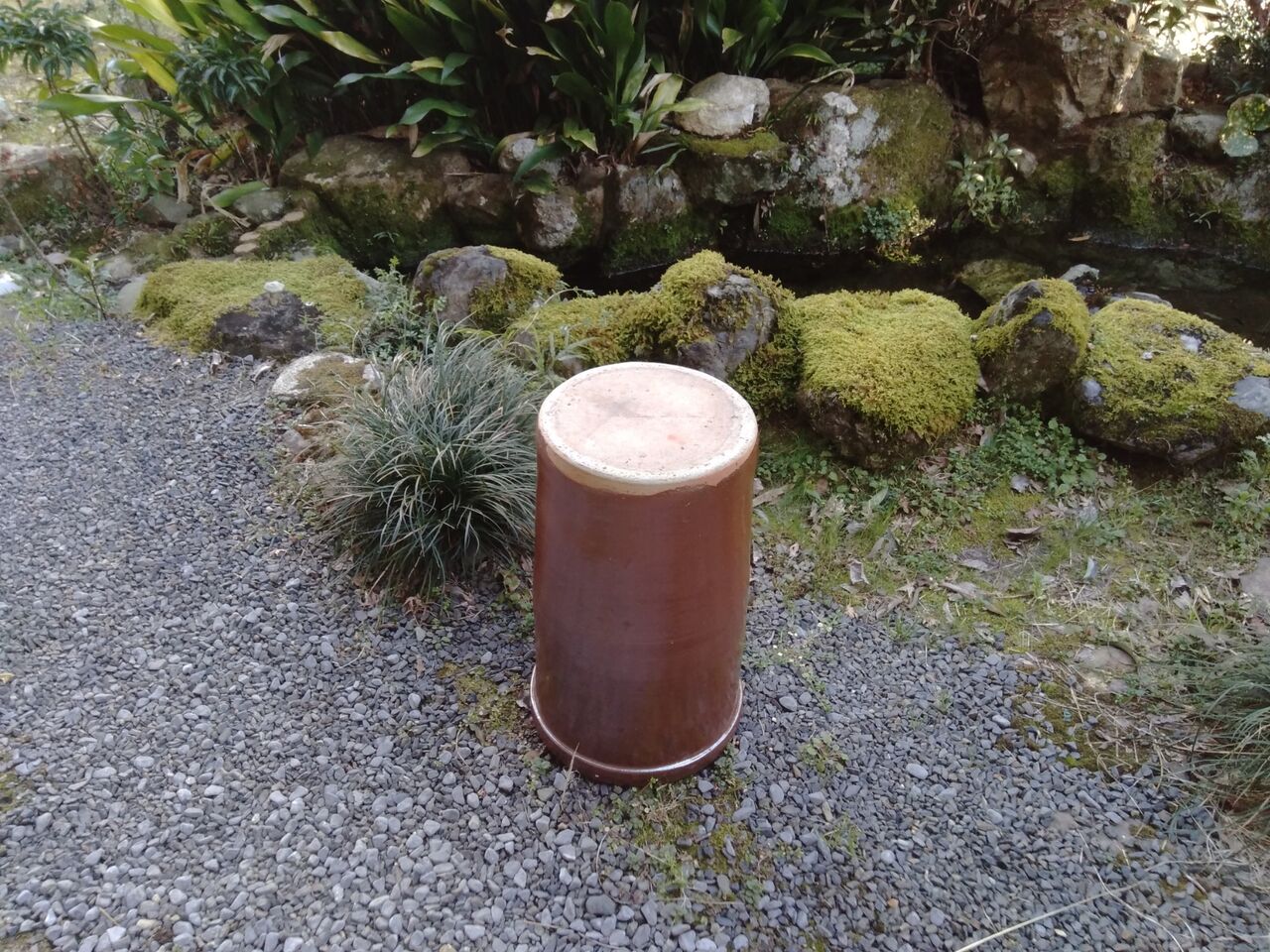 中身を廃棄して、壺はビオトープのメダカを見る時のイスとして使っています。