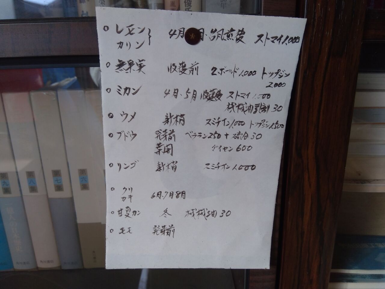 今も小屋に貼ってある親父のメモです。(農薬、肥料の覚え書きのようです。)