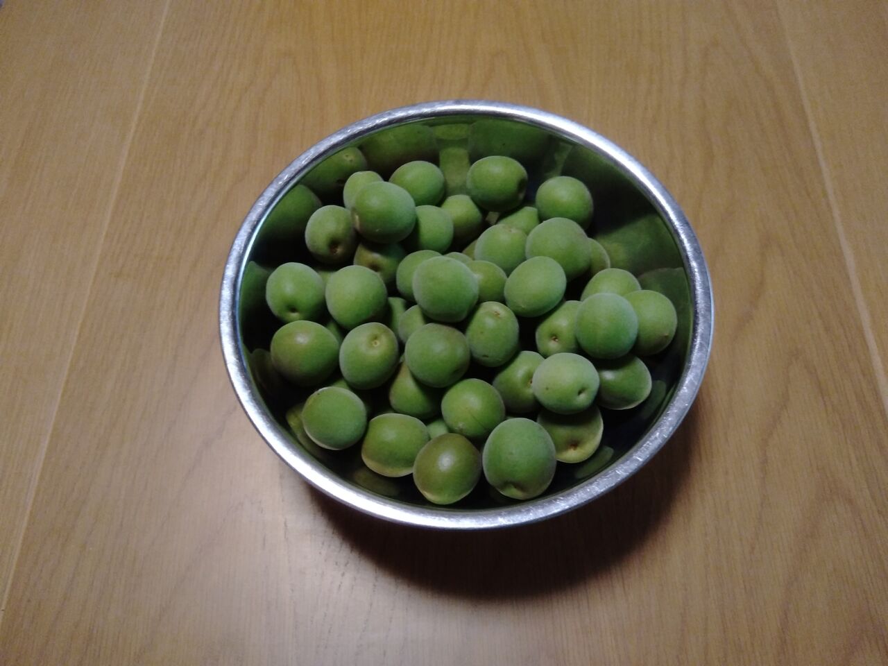 梅ジュースを作ろうと思います。 1kg分だけヘタを取って、水洗いしました。