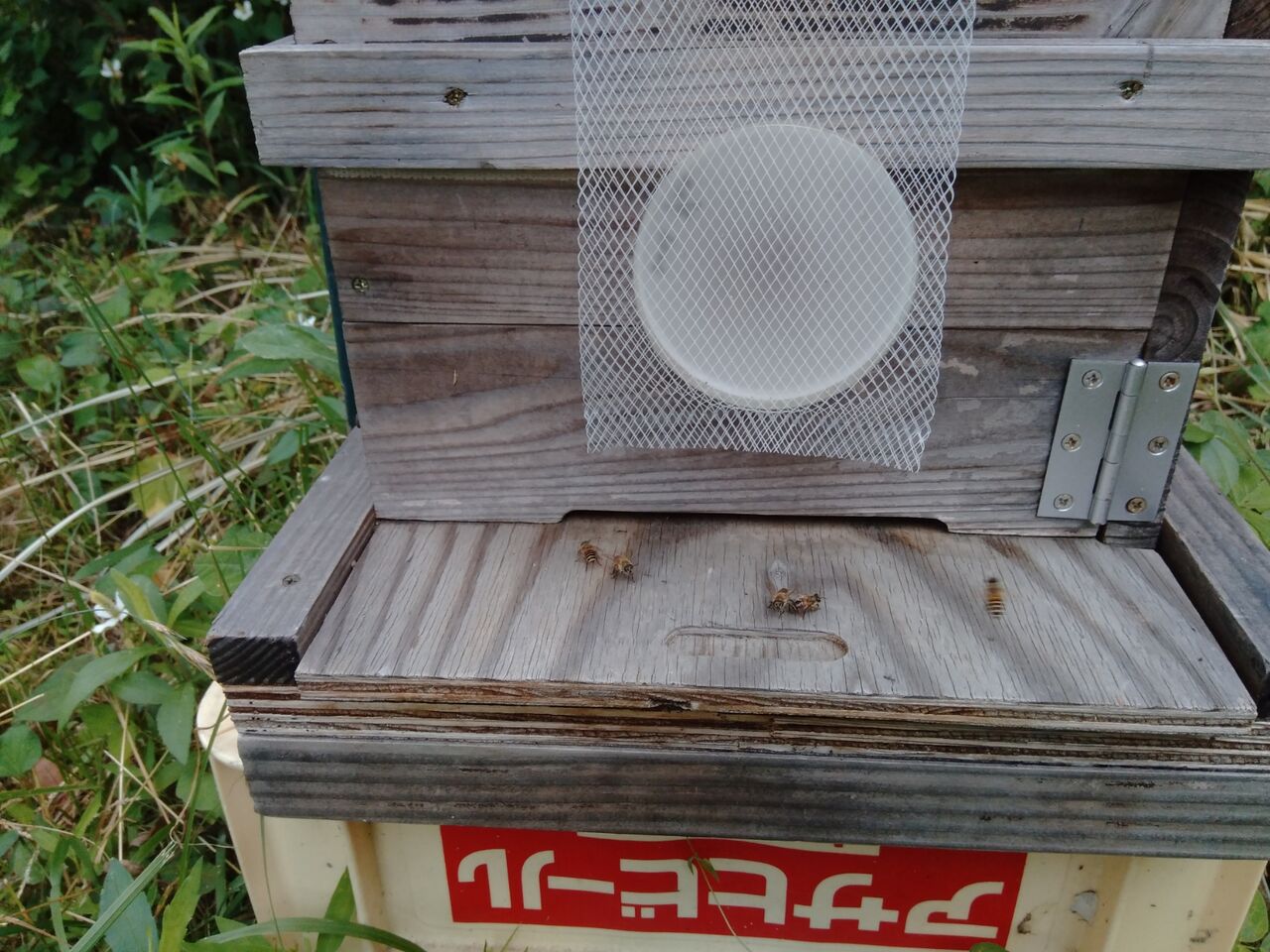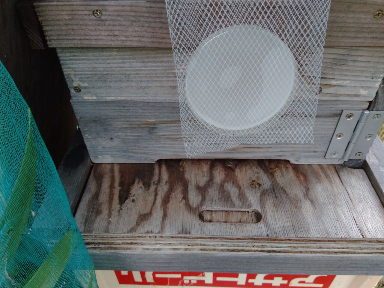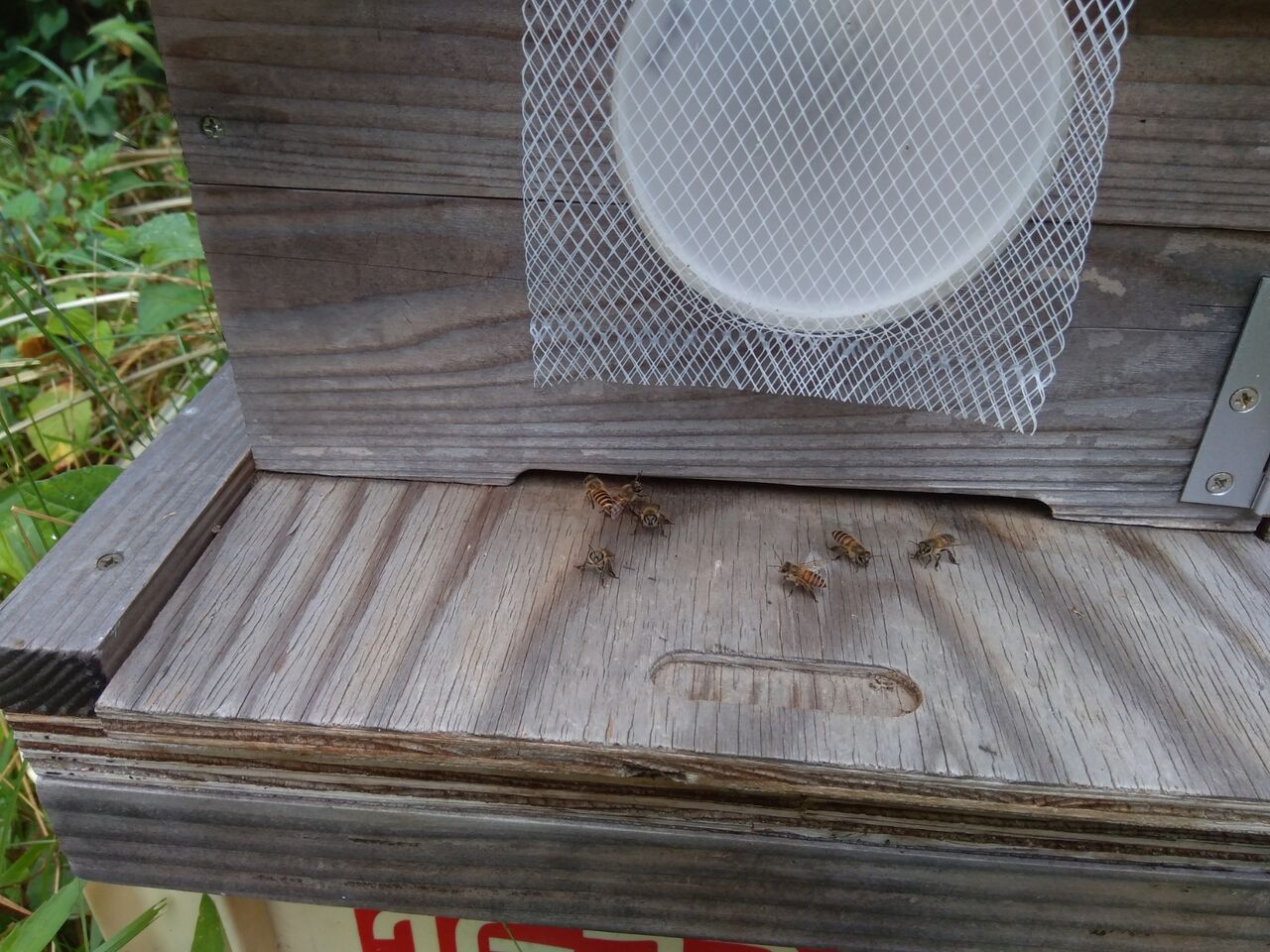 一昨日の6月12日の朝、巣箱を見に行くと、どちらの巣箱も、巣門にたむろしている蜂や出入りしている蜂がたくさんいて、入居を確信しました。
