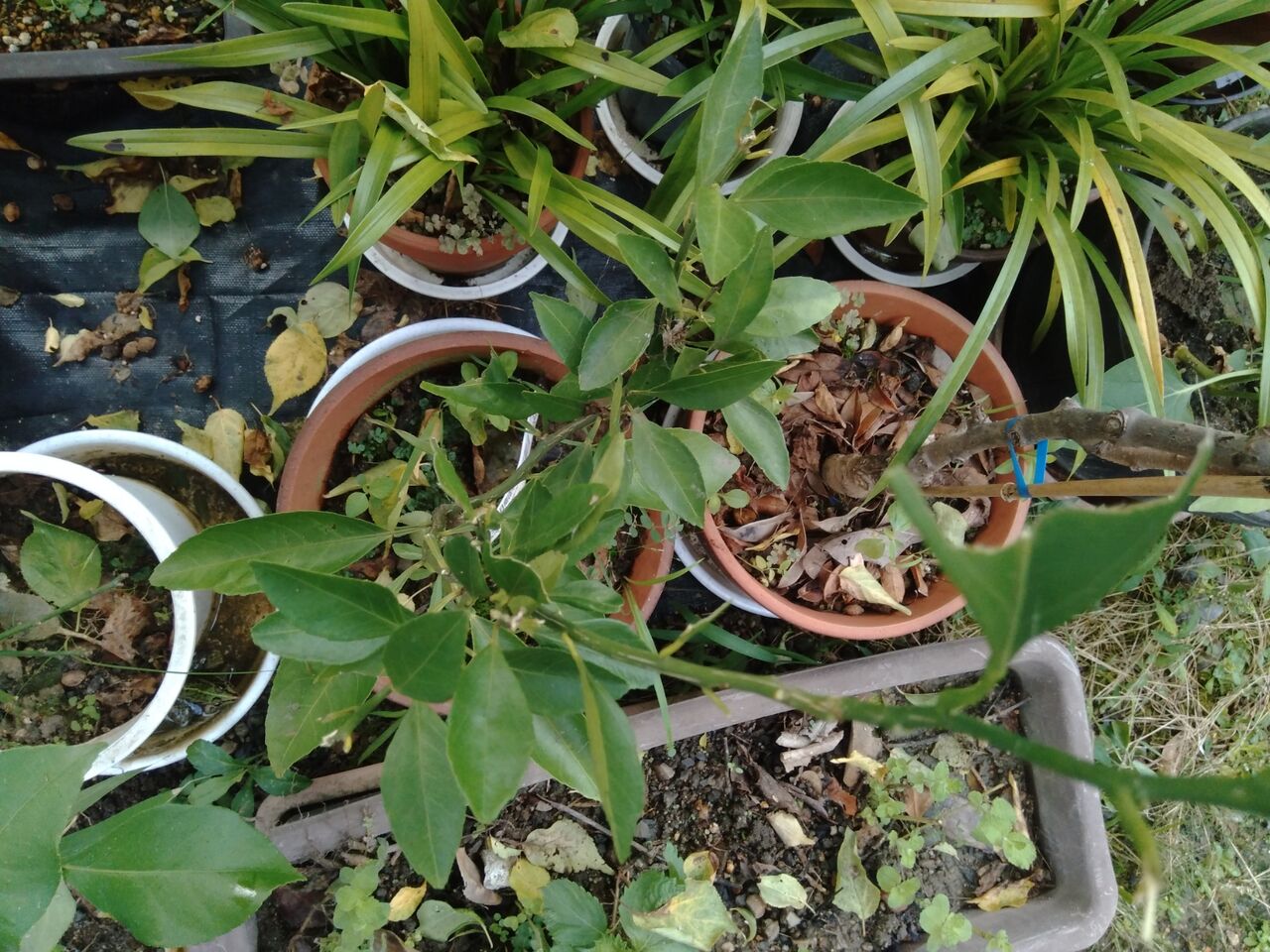 オシロイバナとミカン、レモンの鉢をネットで囲っている畑に移しました。
