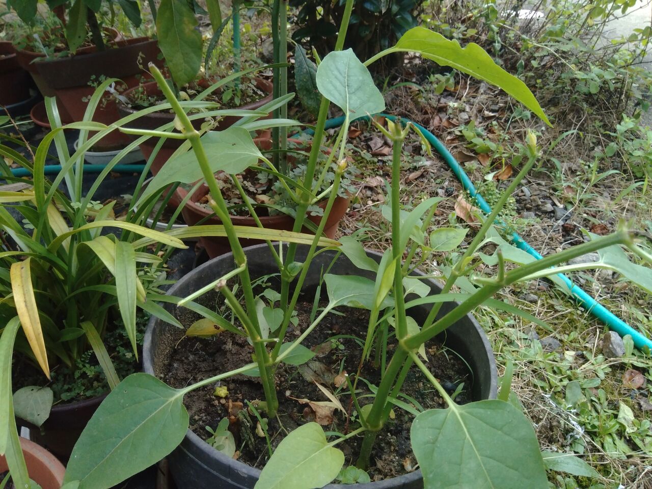 朝見ると、一昨日にUPした黄色のオシロイバナの近くに置いていた鉢植えのミカンの葉と枝がなくなっていました。