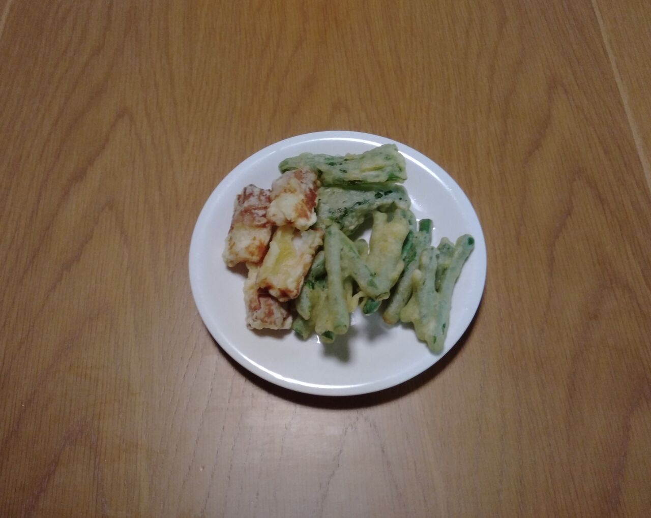 冷蔵庫にあった竹輪、畑から穫ってきたインゲンとピーマンを天ぷらにしました。