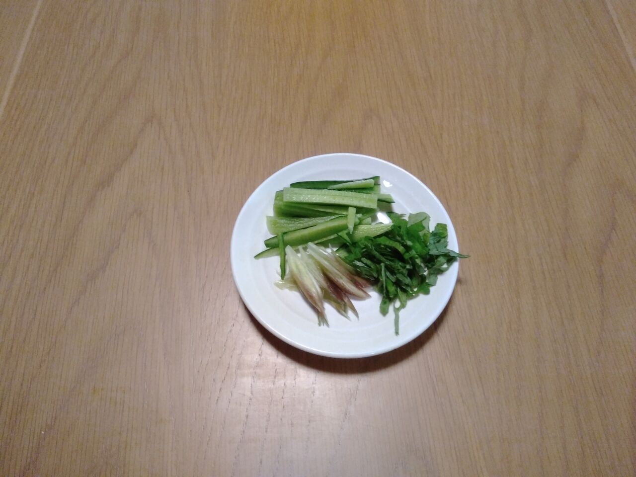 畑で穫ってきたキュウリの千切り、それと、ゴマ、おろし生姜です。