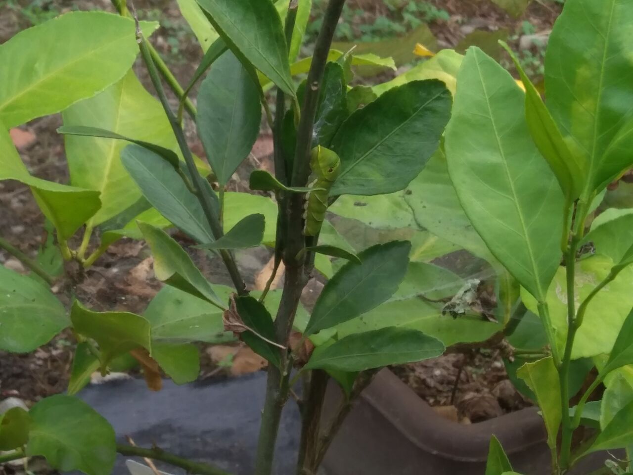 葉っぱが少なくなっているので、よく見ると、アゲハチョウの幼虫がいました。