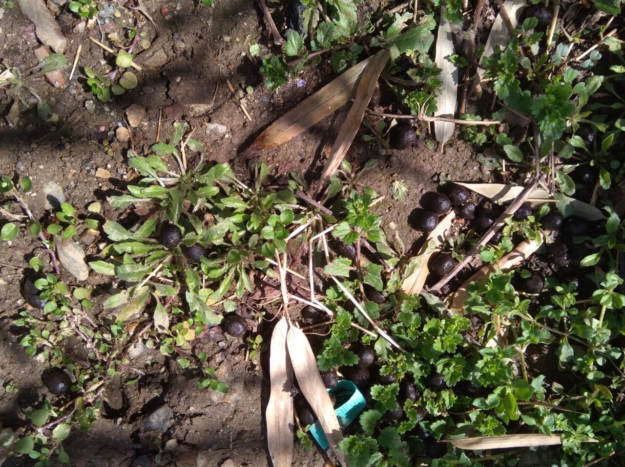 これは、鳥ではなくて動物の仕業だと思い、付近を見回すと鹿の糞が落ちていました。