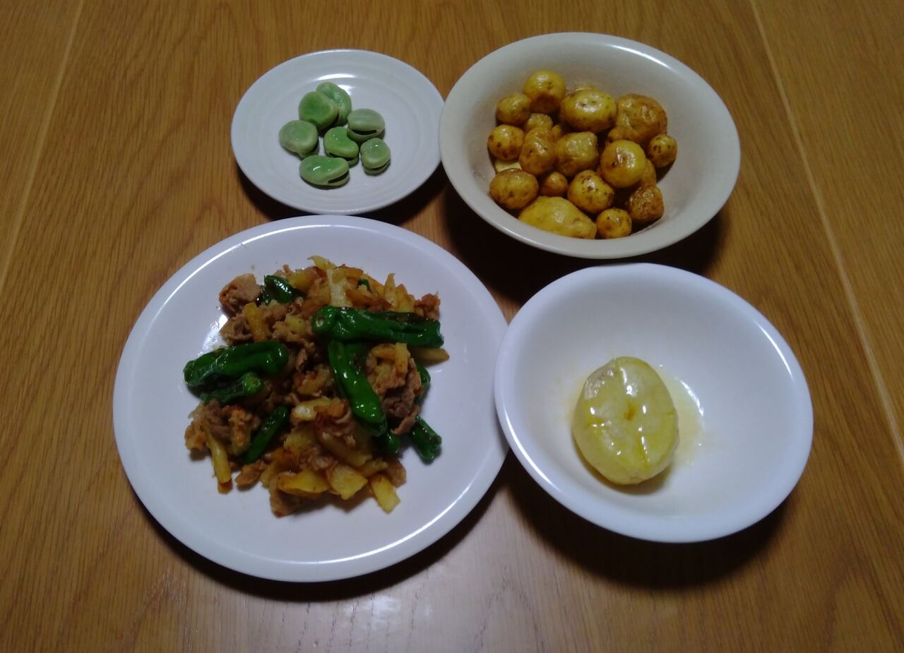 左下は、傷ついたジャガイモと収穫した獅子唐を昨日紹介した「こっくりみそ豚」といっしょに炒めたものです。