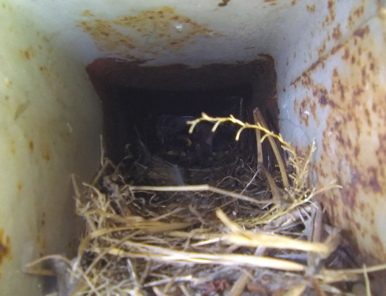 母屋と離れの間にある井戸端の屋根を支えている鉄の角パイプの中へ、餌を運んでいました。