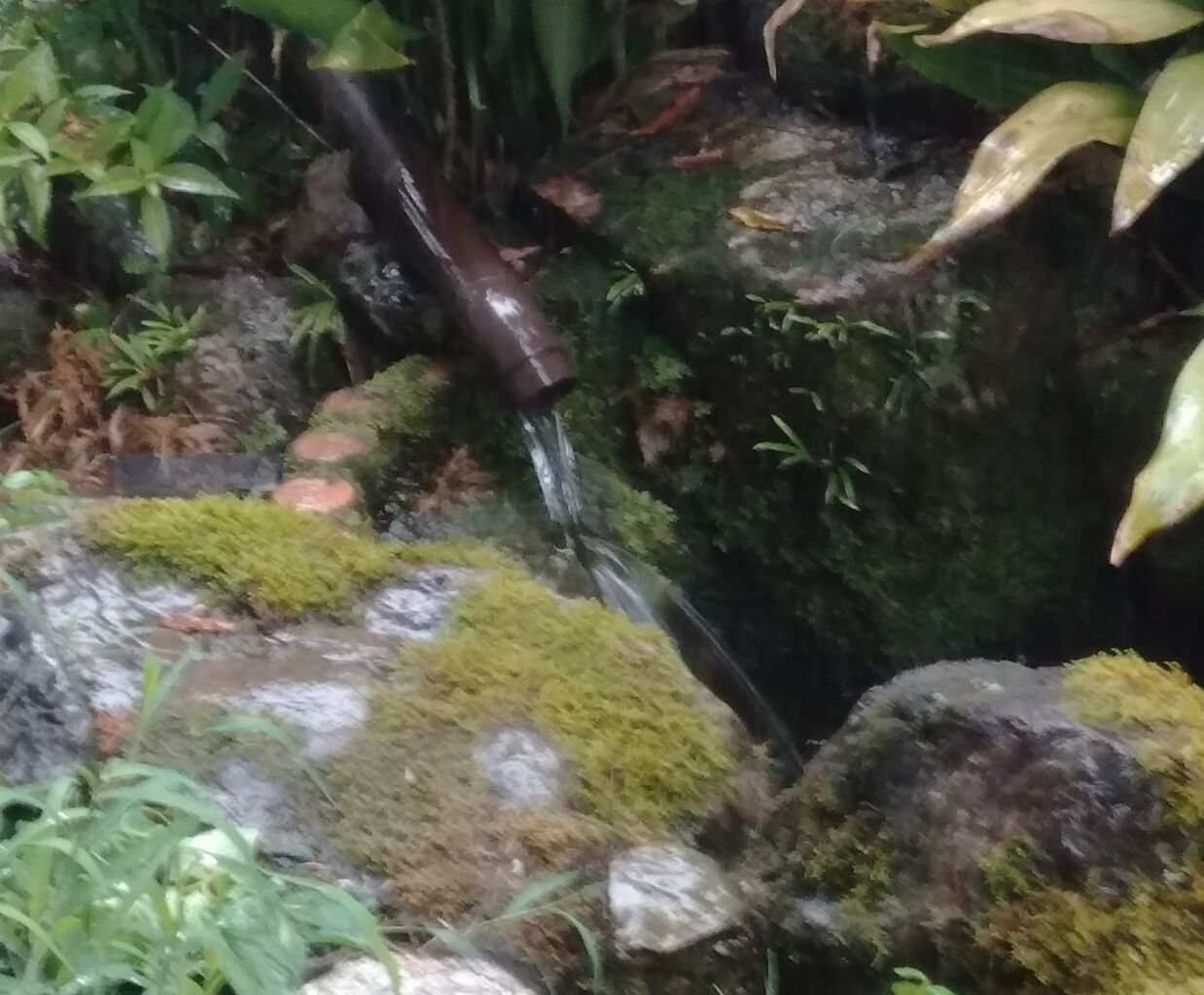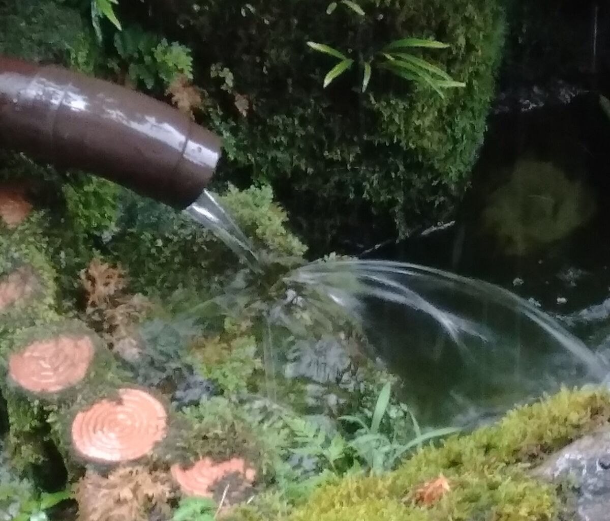屋根に降った雨水が、私の設置した竪樋を通ってビオトープに流れ込むのを期待していました。
