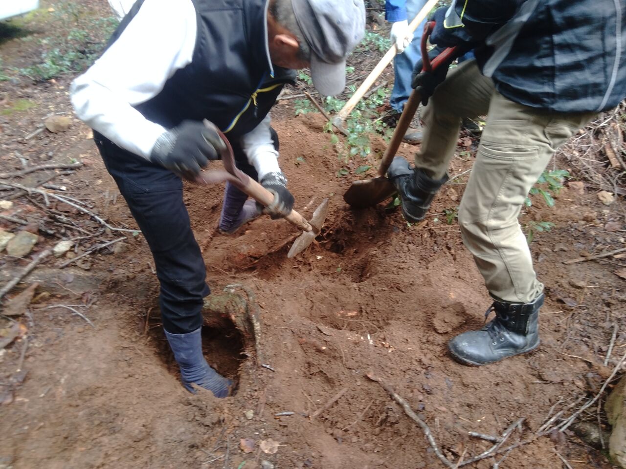 午前中の作業は、3~4mの背丈に育ったヒノキの周りの下草刈りでした。