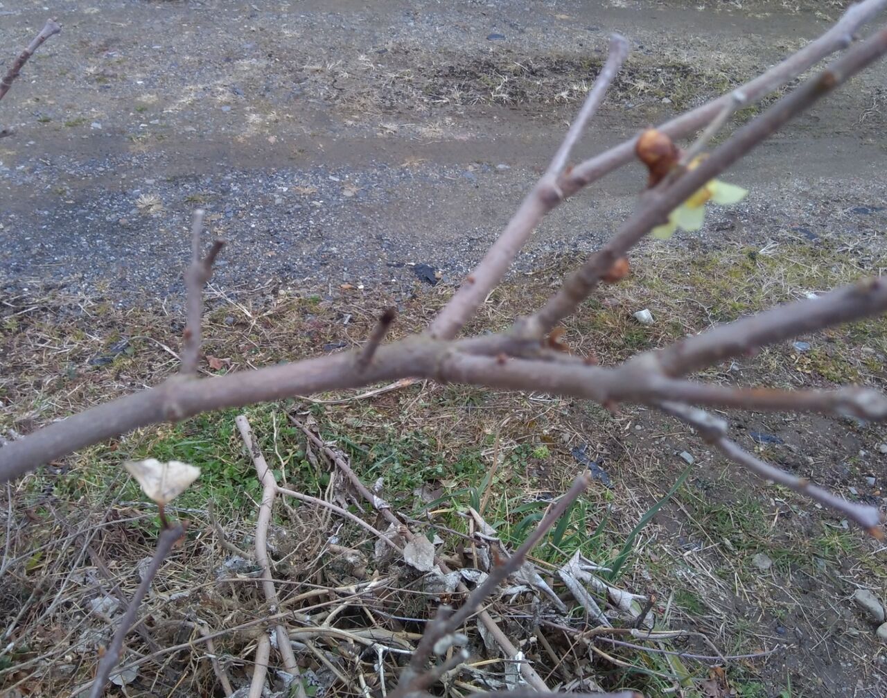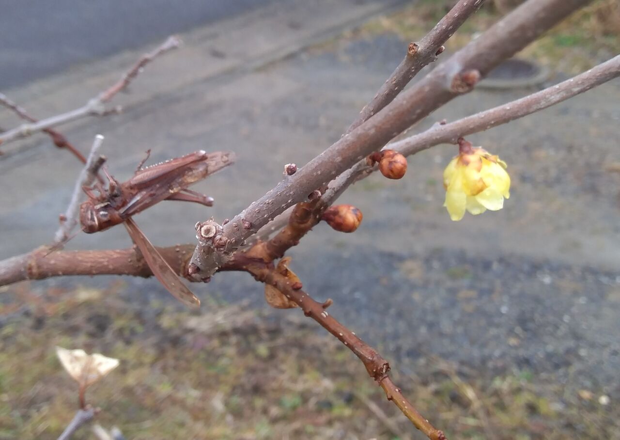 蝋梅(ロウバイ)の枝に刺さっていたバッタが、いなくなっていました。