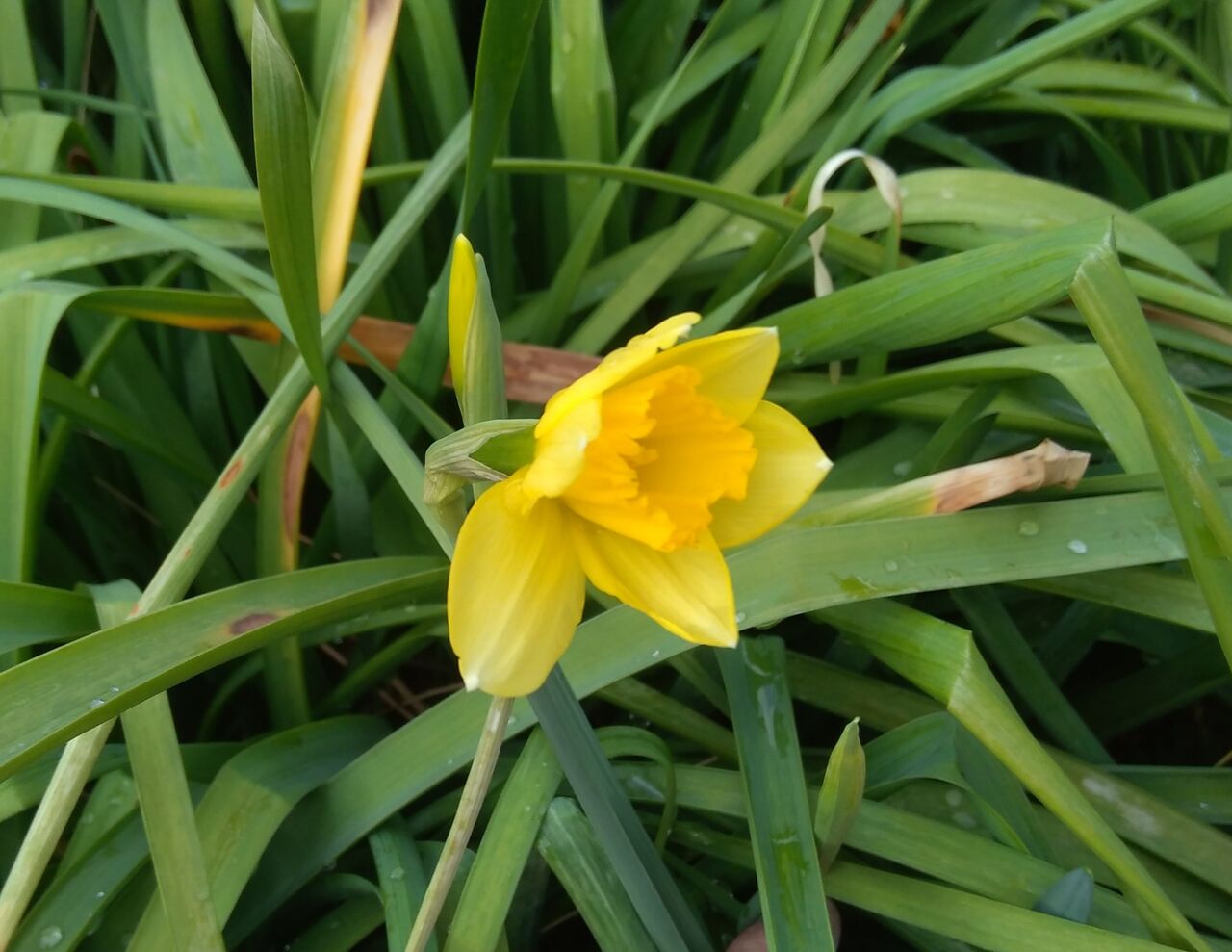 黄色のラッパ水仙(スイセン)が咲きました。