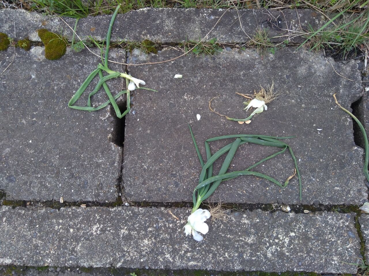 家の前の側溝に、玉ねぎが散らかっていました。