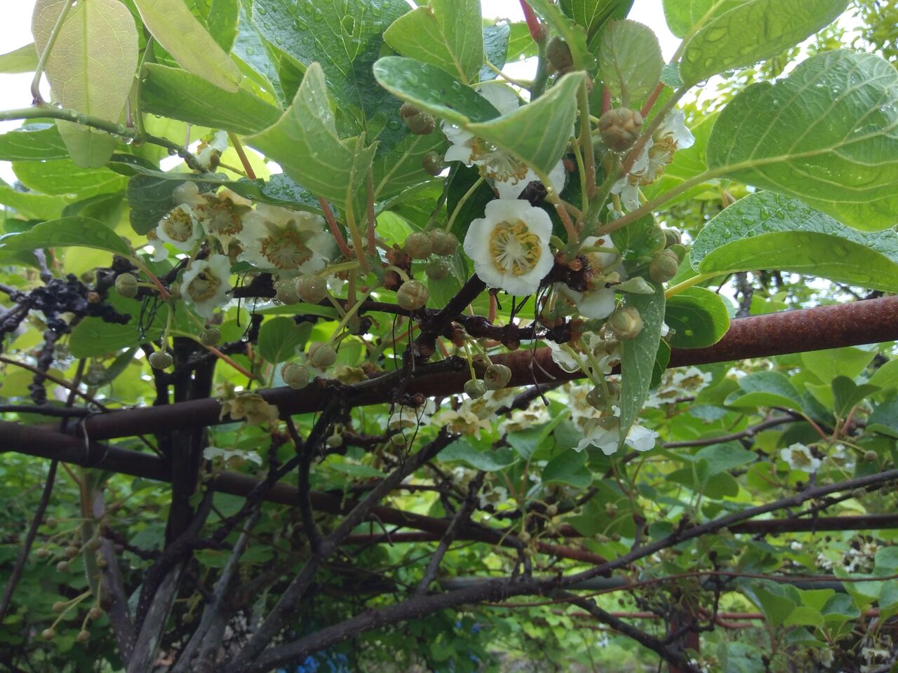 蕗を収穫している時、ゴールドキウイの雌木に花が咲いているのに気づきました。