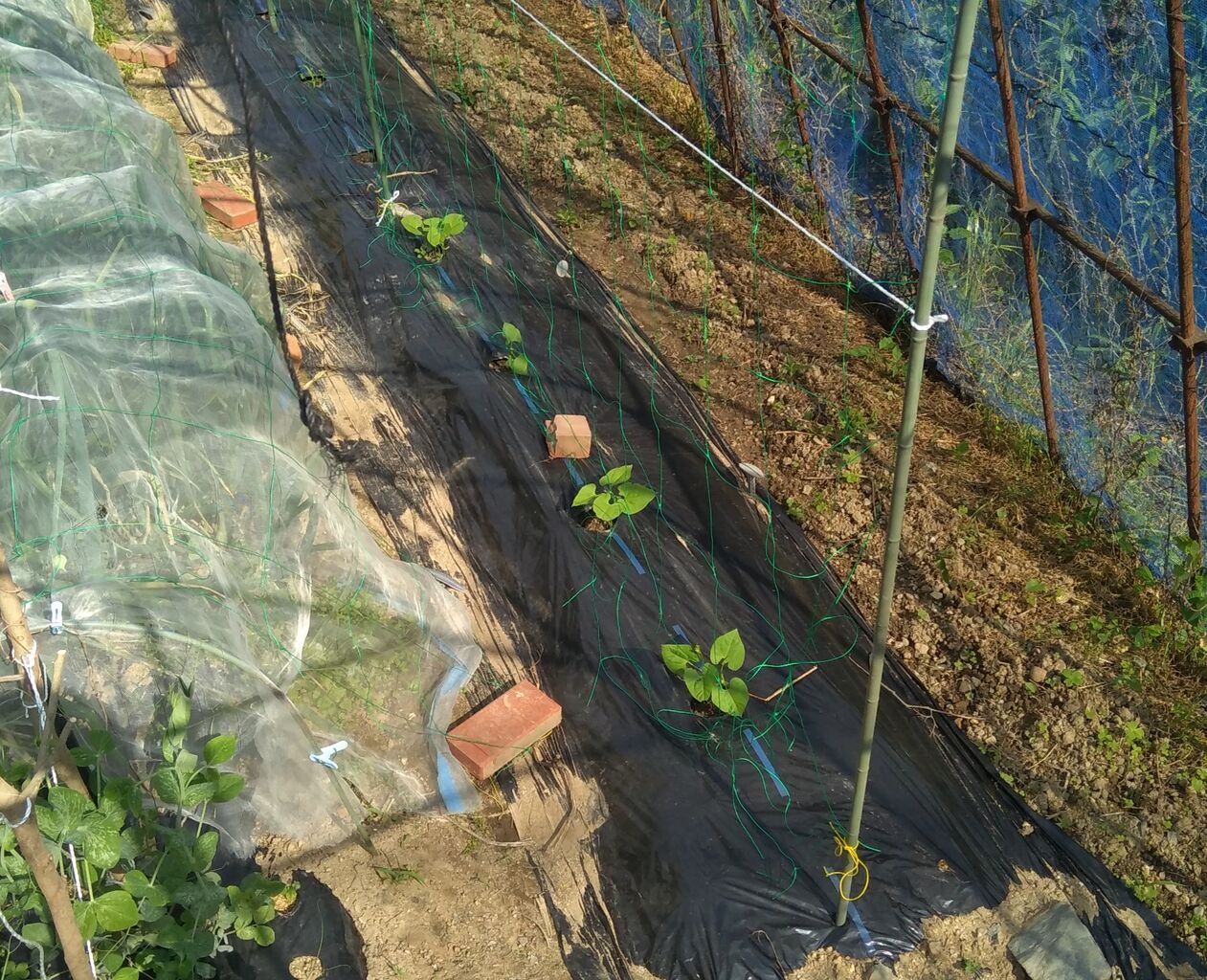 午後は、インゲン豆の支柱を立てて、ネットを張りました。