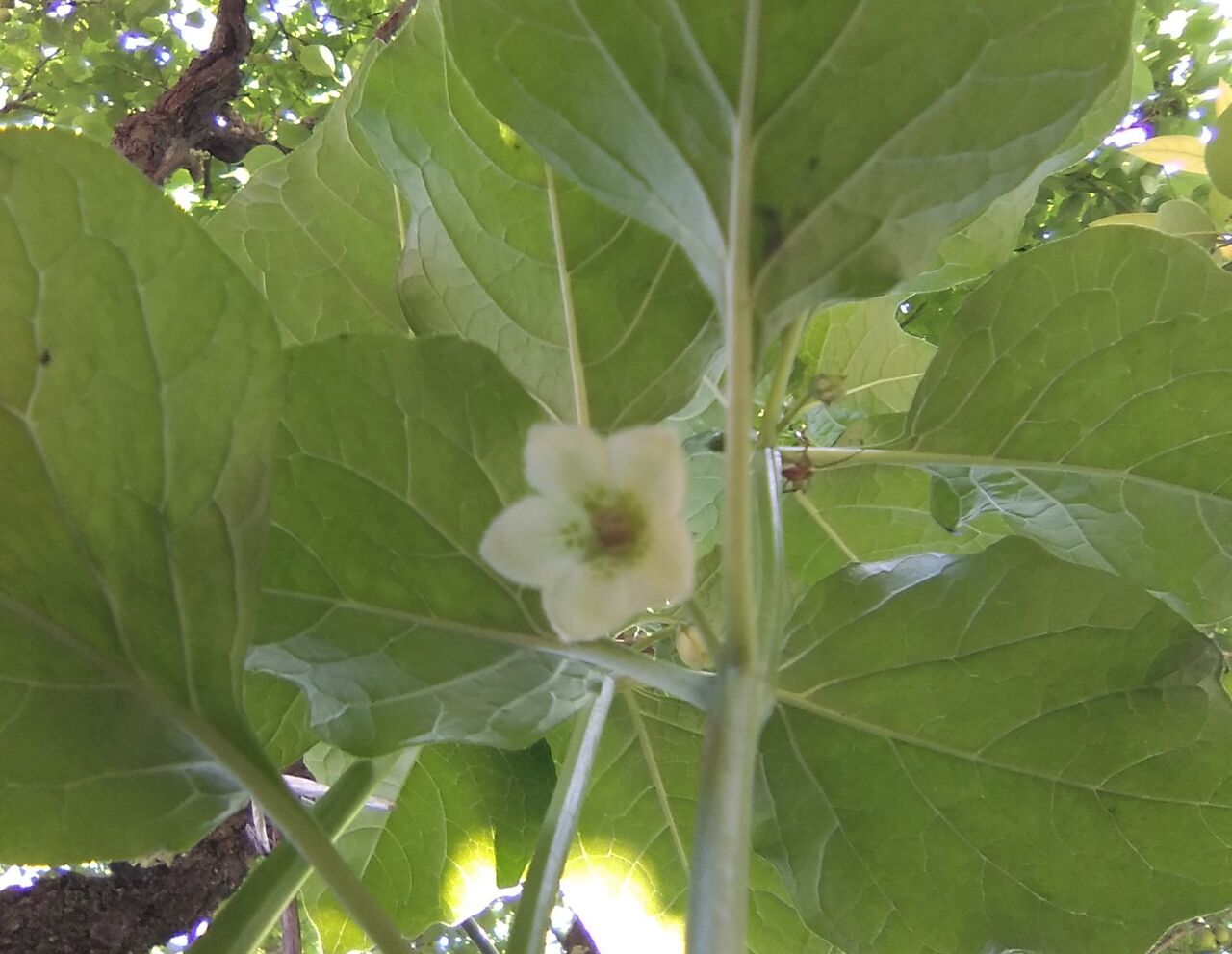 気がつかなかったのですが、鬼灯(ほおずき)の葉は下に花が咲いていました。