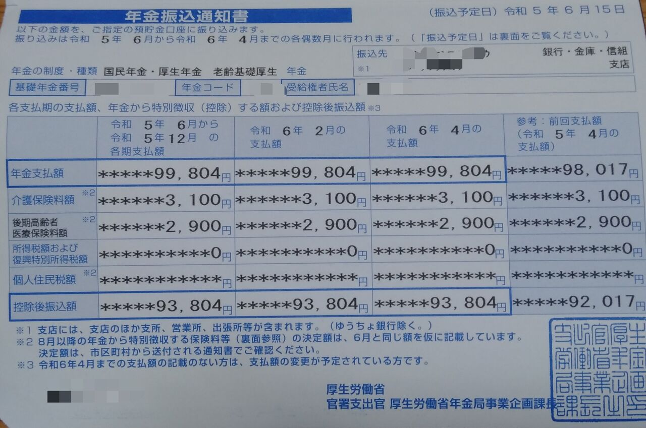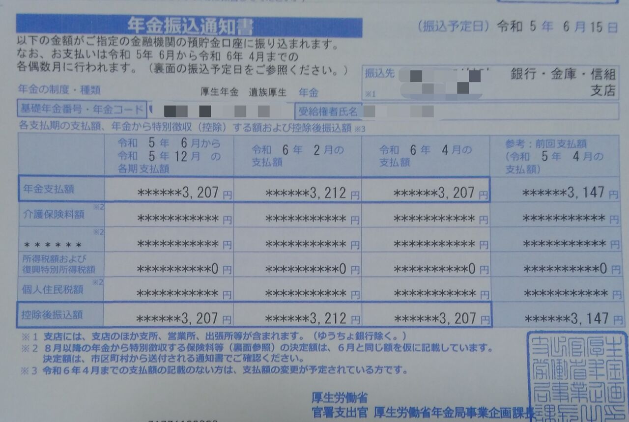 お袋の令和5年6月からの年金です。