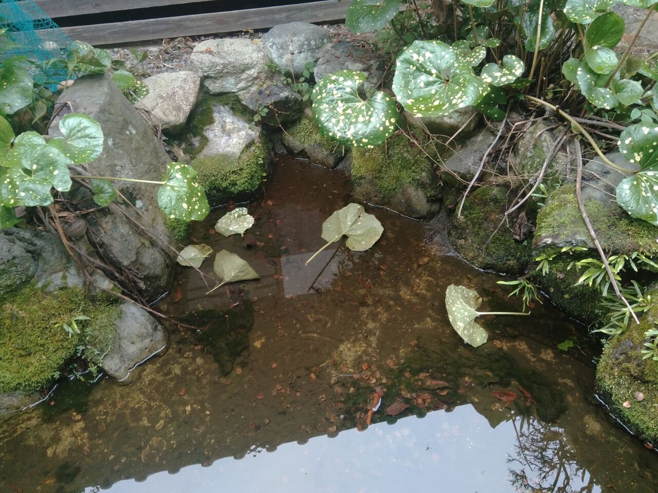 ビオトープ脇の石蕗(ツワブキ)が、鹿に食べられています。