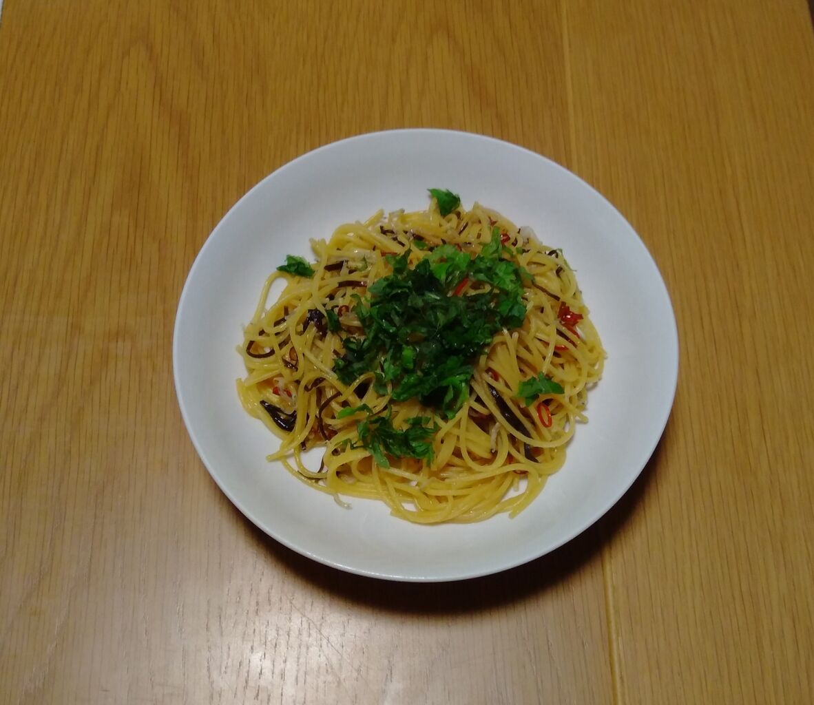 ペペロンチーノに、じゃこと塩昆布が入っているだけです。