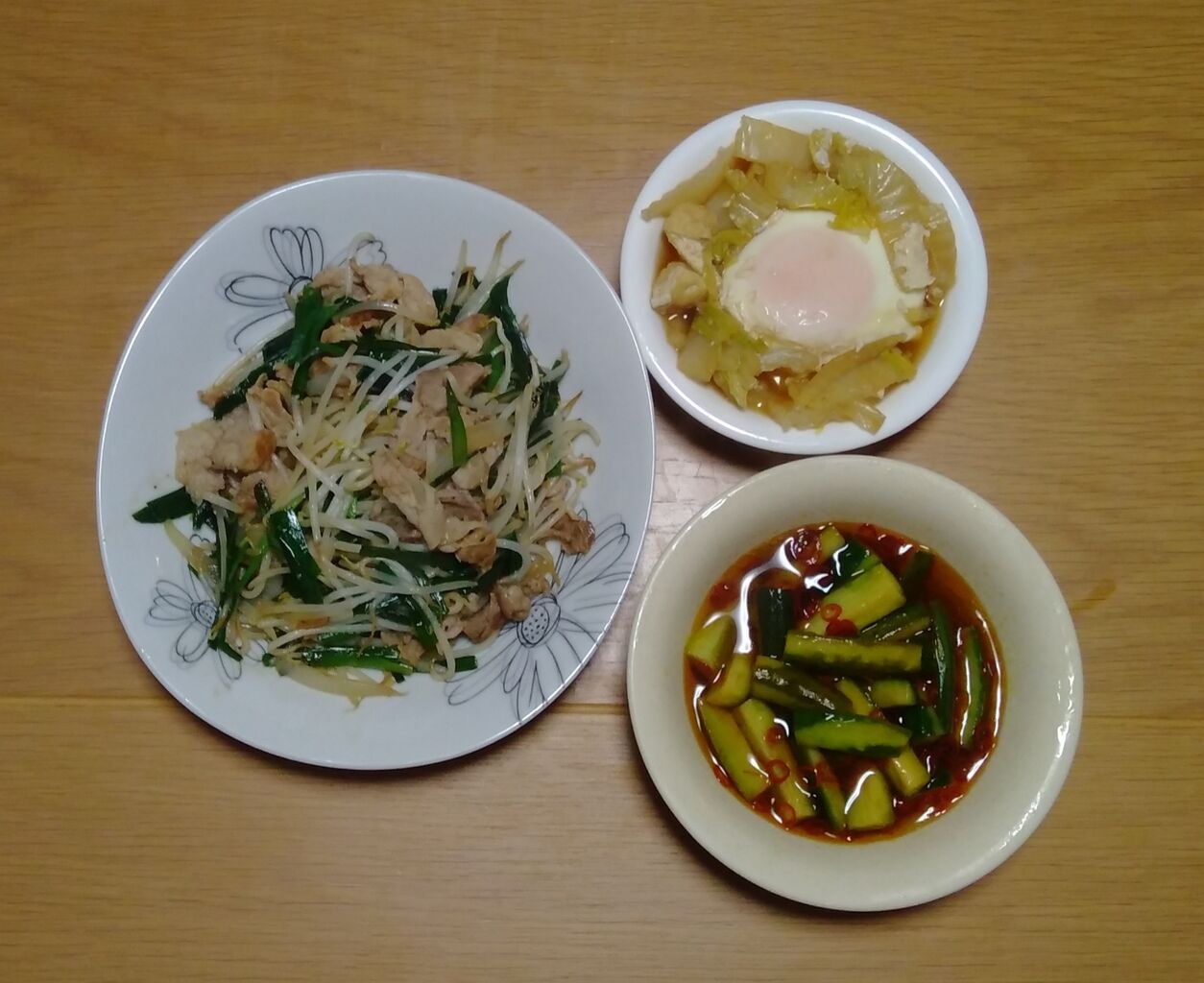 豚肉、玉ねぎ、ニラ、もやしの野菜炒め、白菜とお揚げの煮物にタマゴ、そして、キュウリのカッパ漬けです。