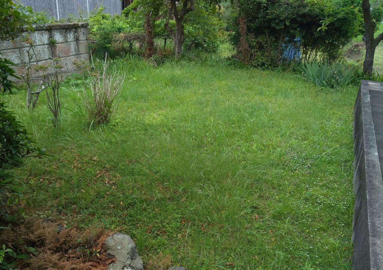 下の写真は、これまで何度も草刈りの記事でUPしてきた母屋の居間の前庭です。