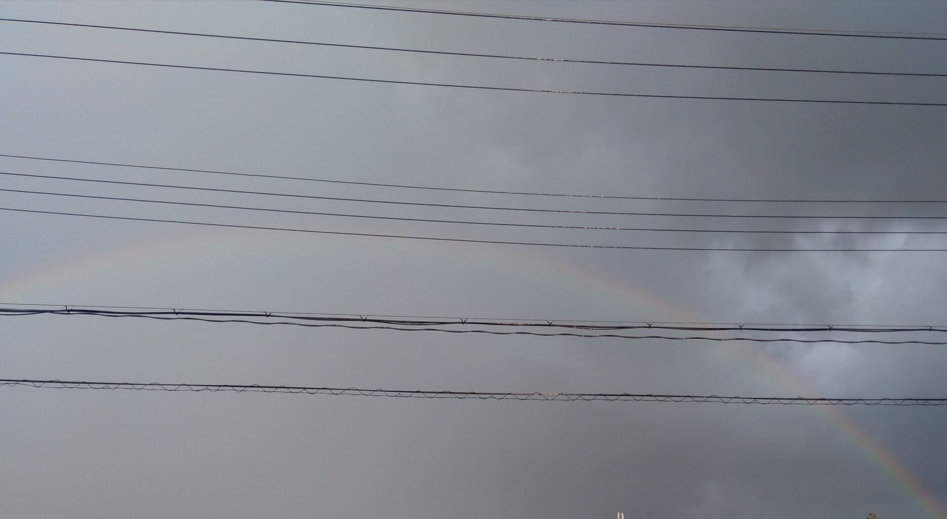 東の空に虹がかかっていました。(今さらのように、電線の多さにビックリ!)