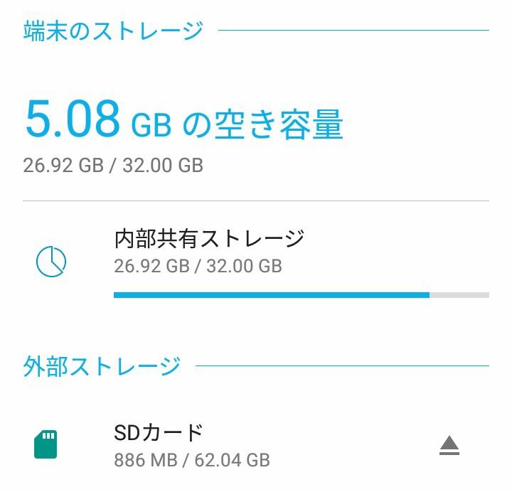 外部ストレージ(MicroSDカード)を62GBにして、内部ストレージから写真、動画、ファイルを移動しました。