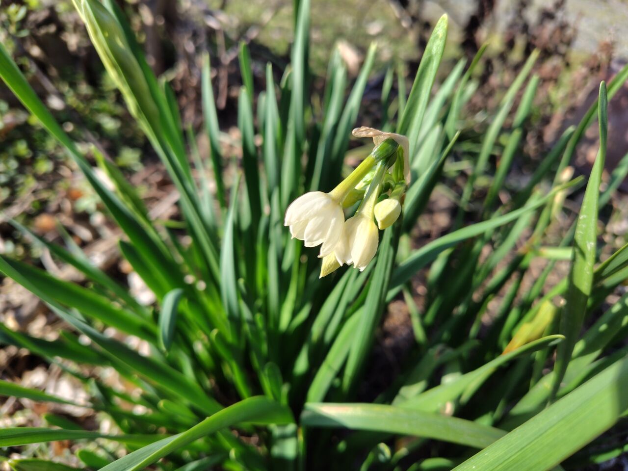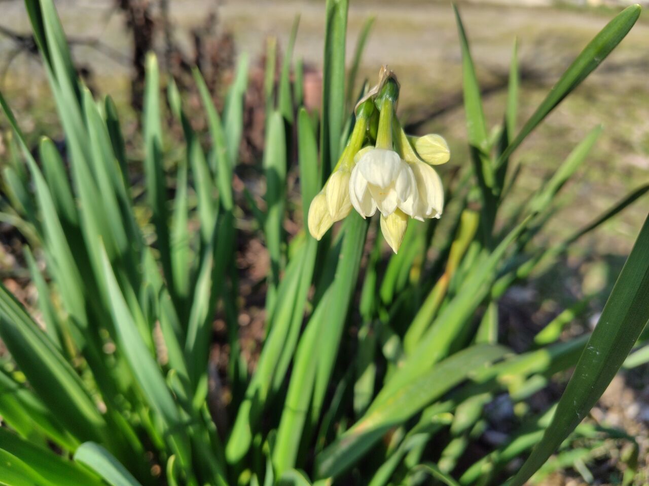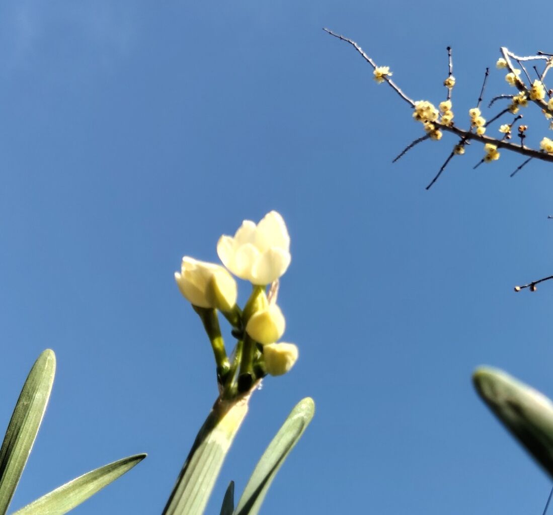 よく見かける水仙と違って、真っ白です。