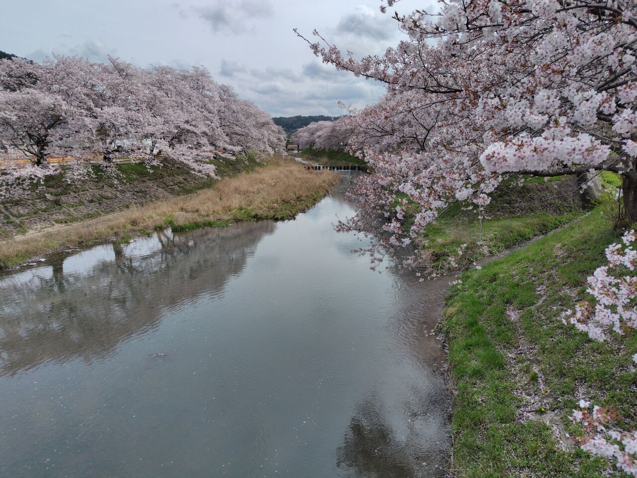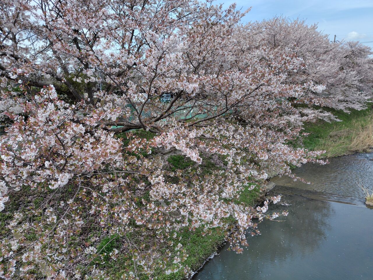 近所の川岸の桜はピークを過ぎて、川面には花筏が連なっていました。