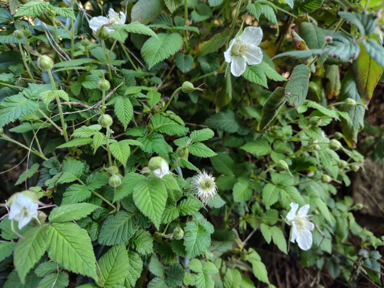 倉庫の裏やキウイの棚の下に、野いちごの花がたくさん咲いています。