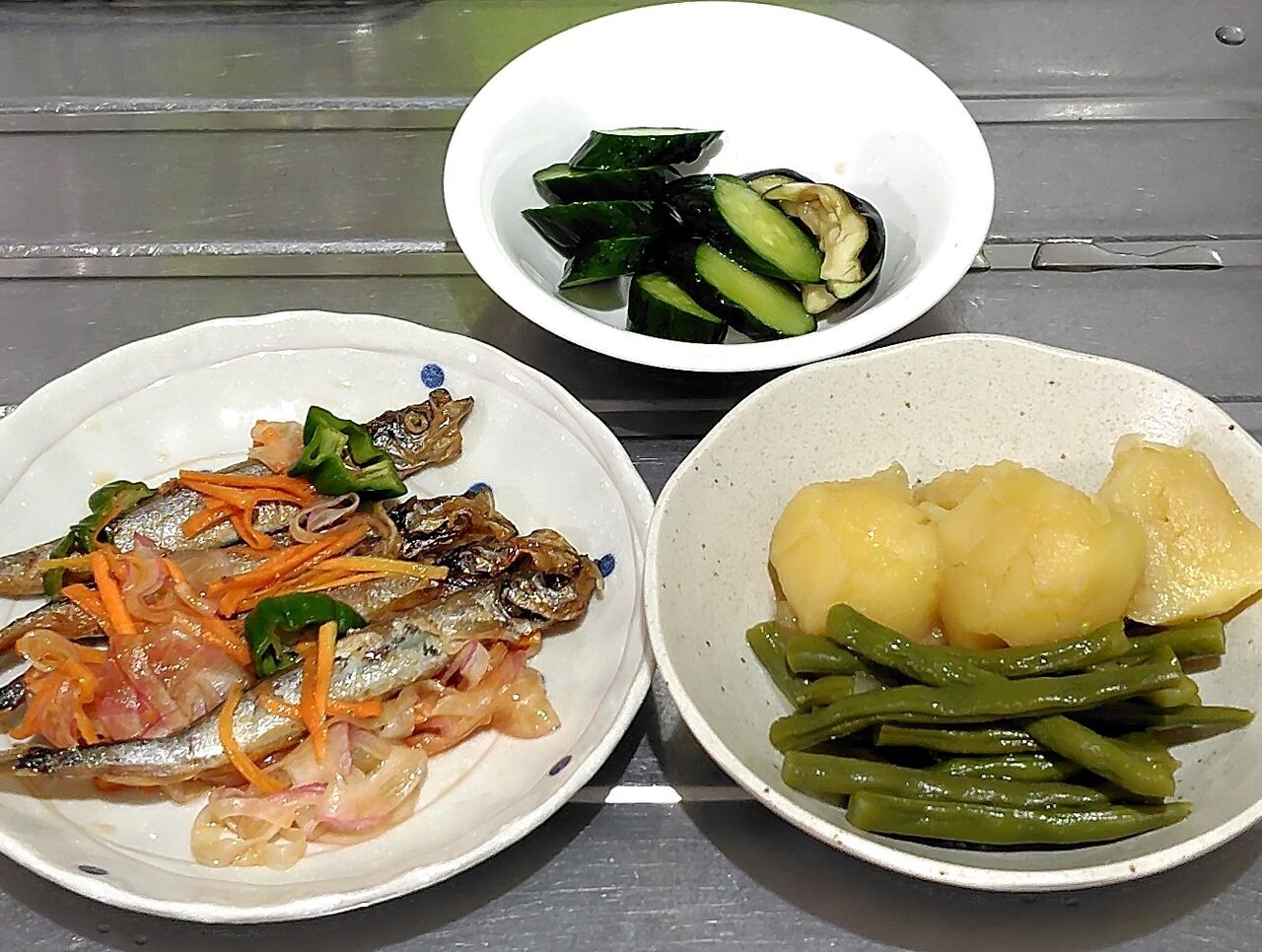 キュウリと茄子のぬか漬け、ジャガイモとインゲン豆の煮物、シシャモの南蛮漬けです。