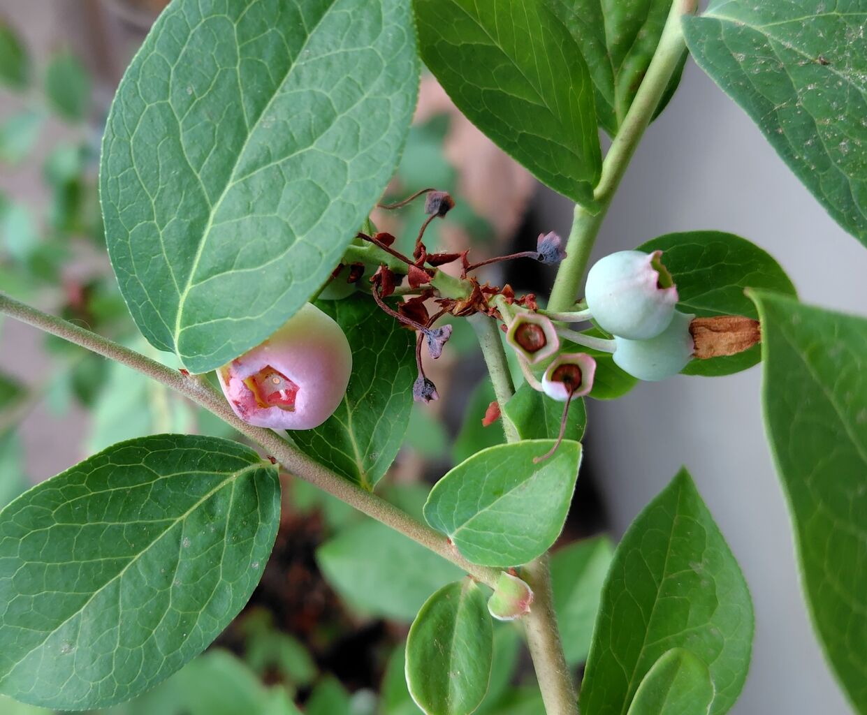 鉢植えのブルーベリーが、少し色づいてきました。