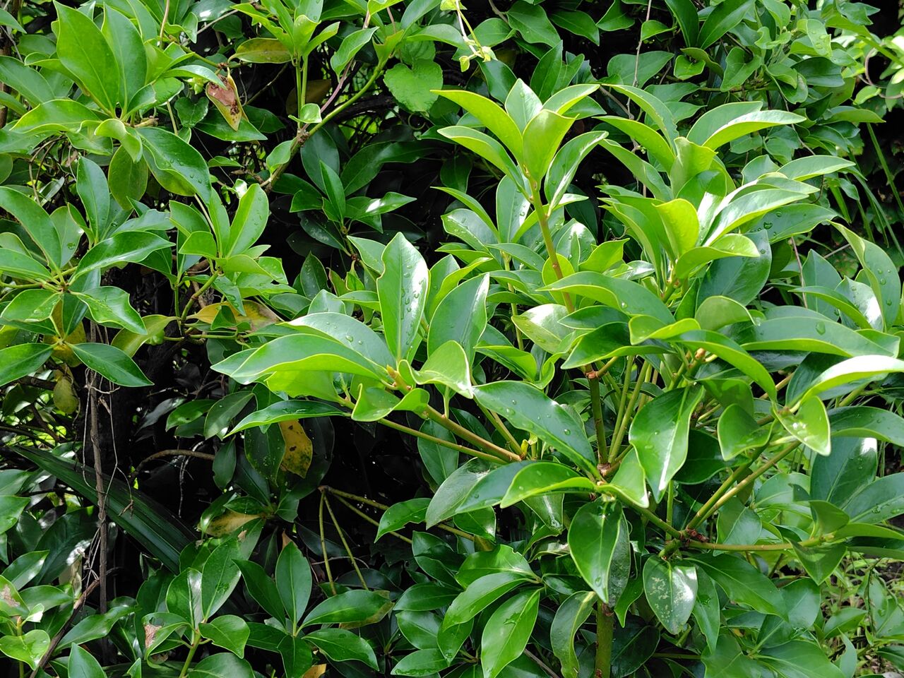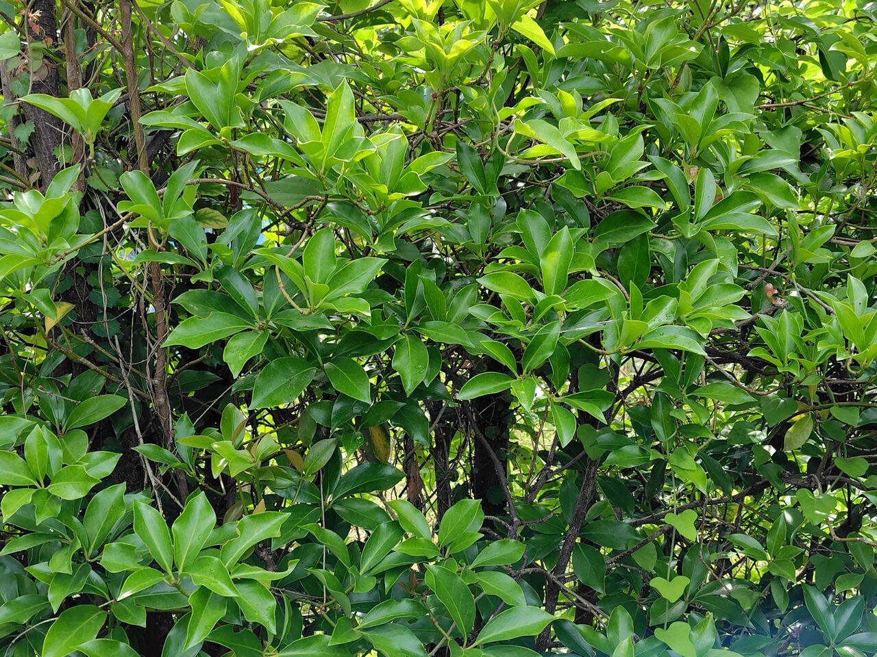 畑のシキビの葉は、眩しいほど輝いていました。
